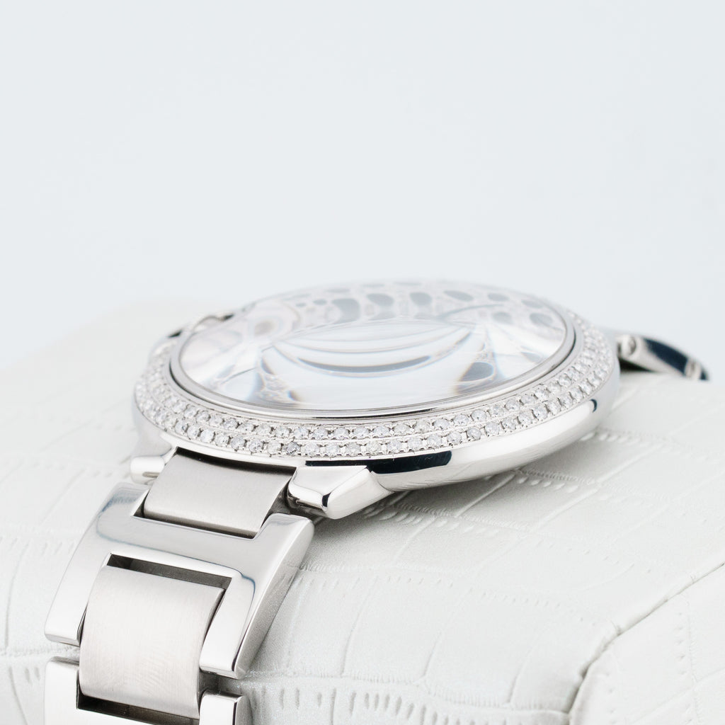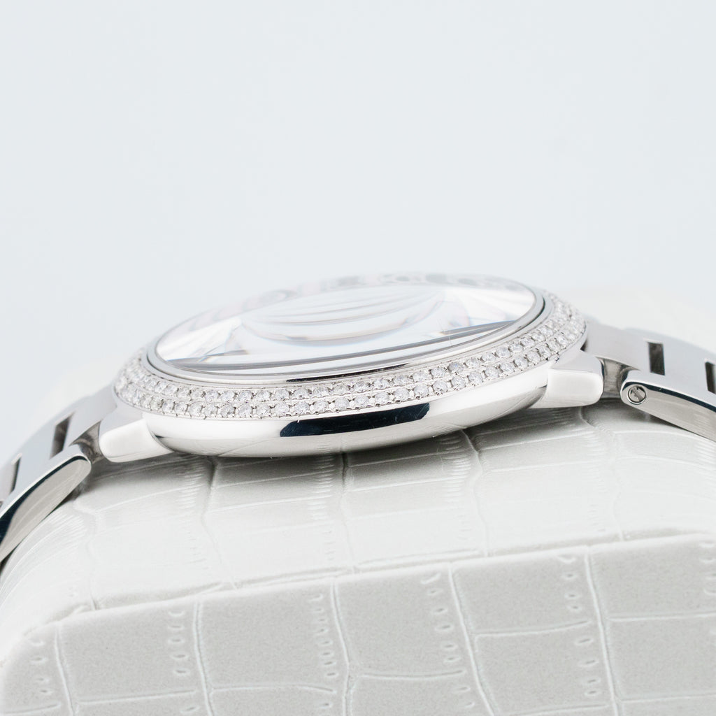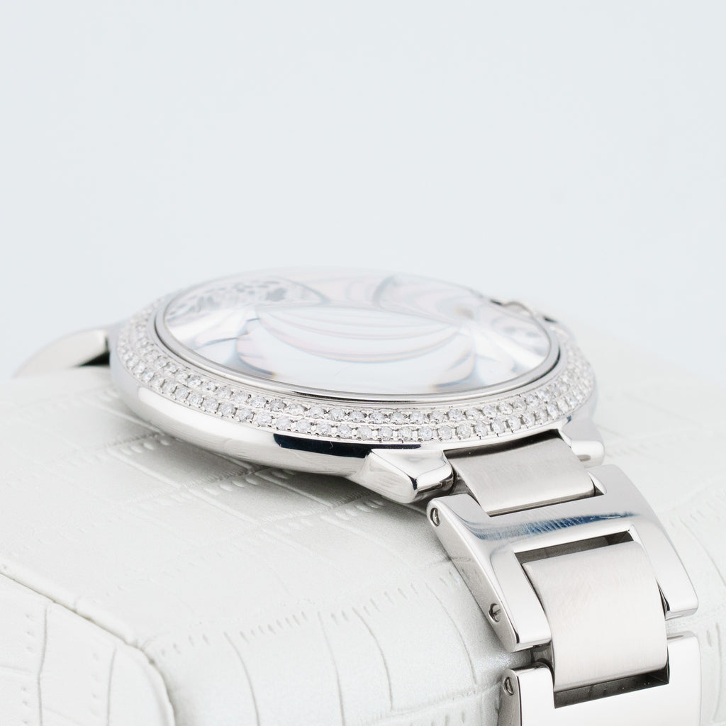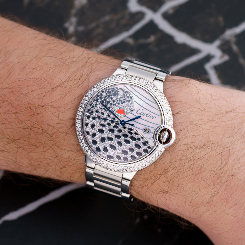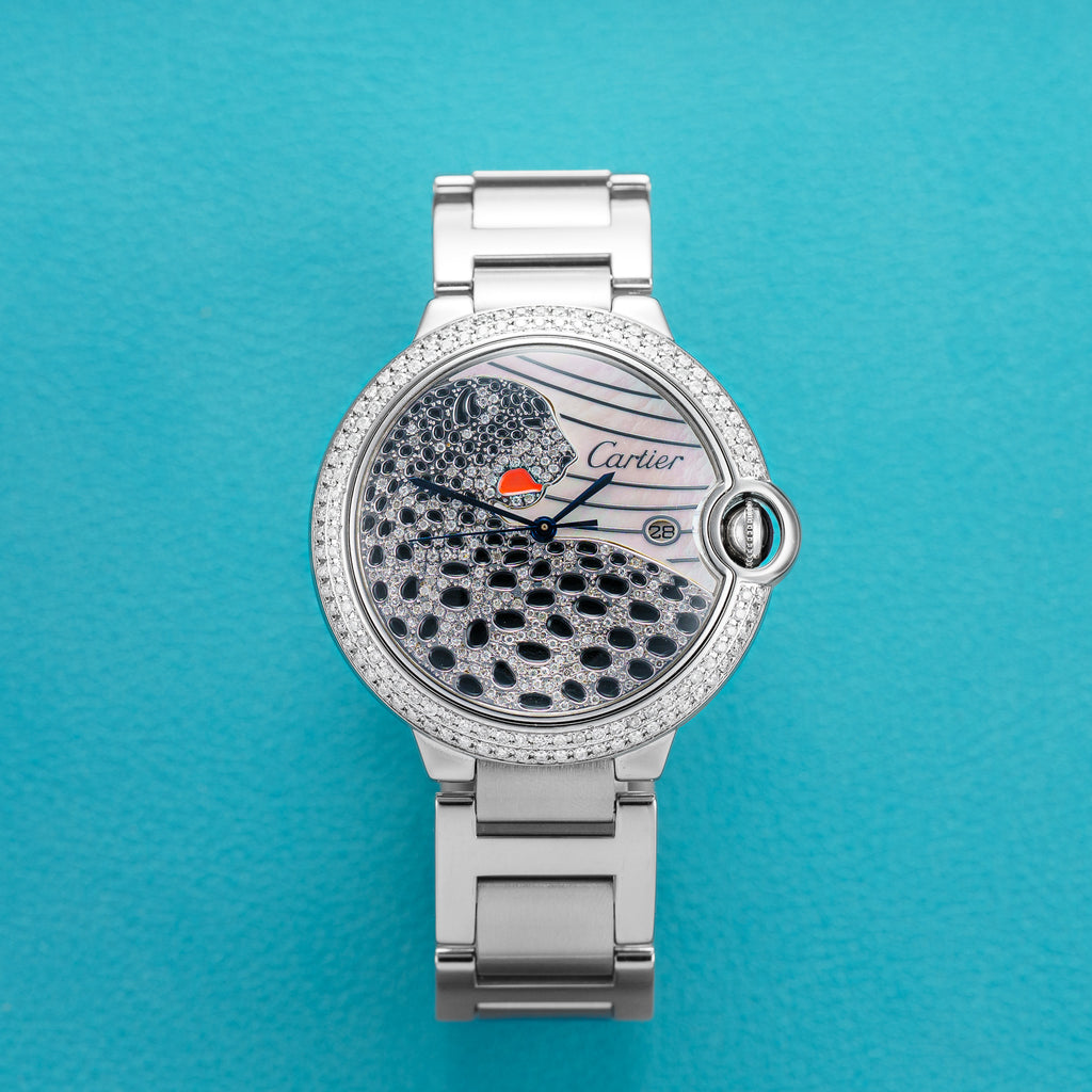 Additional Notes: Great condition. Minimal wear on case and bracelet. Stunning panther mother of pearl aftermarket diamond dial.