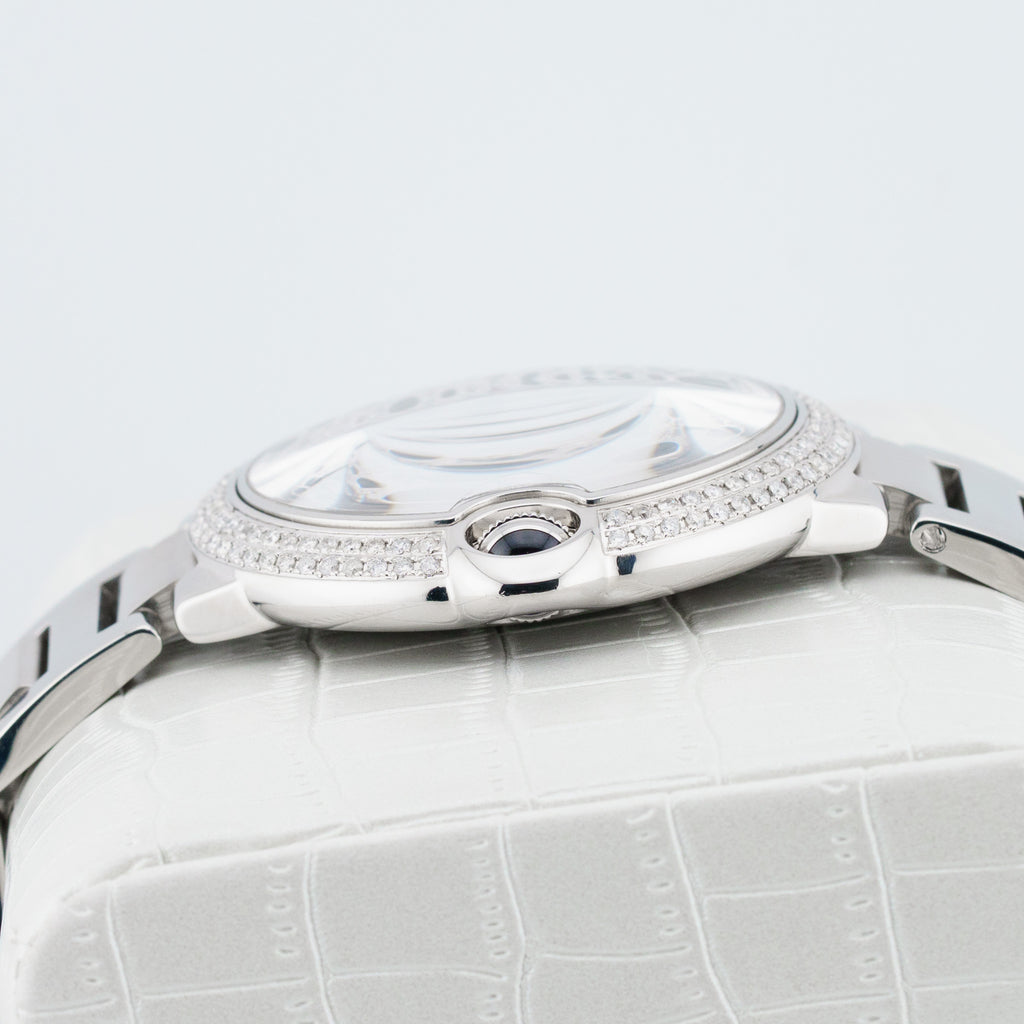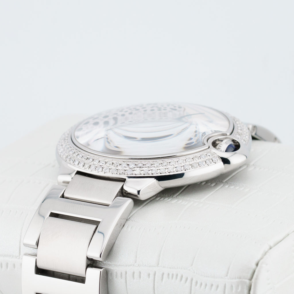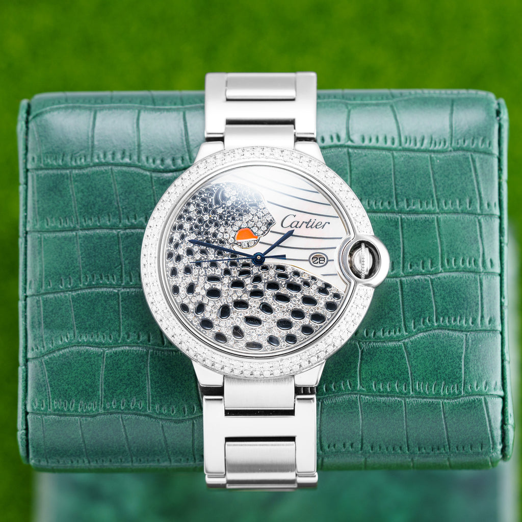 Description: Introducing the Cartier Ballon Bleu W69012Z4, a stunning 42mm watch that seamlessly blends elegance and functionality. Crafted with a durable stainless steel case, this timepiece features a striking blue balloon-shaped crown and a luxurious silver dial, ensuring an eye-catching presence on any wrist. The intricate panther diamond dial and date display add a touch of sophistication, making it perfect for both casual outings and formal occasions. With its precise automatic movement, this watch not only tells time but also makes a bold statement. Enhance your collection with this exquisite Cartier piece that embodies both style and craftsmanship.