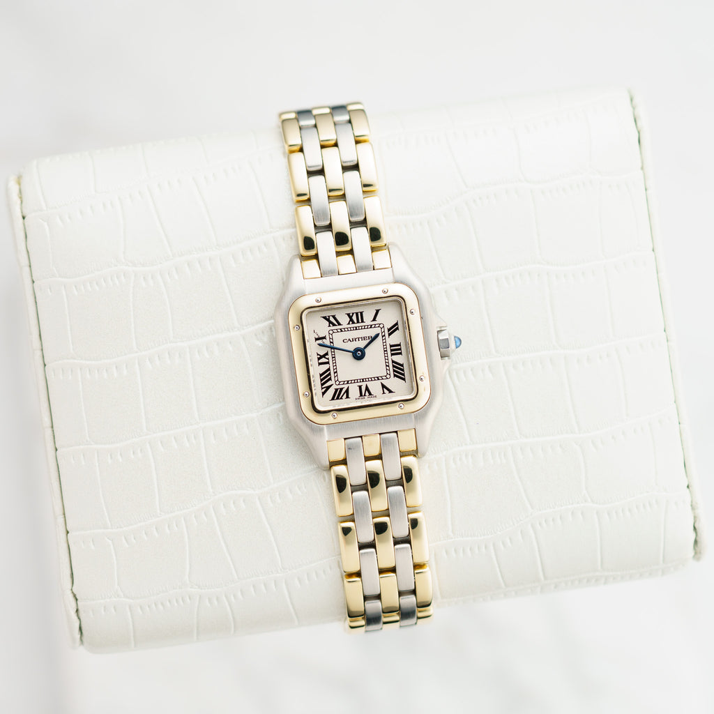 Description: Embrace elegance with this stunning Cartier Panthere watch featuring a luxurious stainless steel and yellow gold case. With its chic 22mm x 30mm dimensions, this piece effortlessly blends sophistication and versatility, making it the perfect accessory for any occasion. The graceful design showcases Cartier’s signature craftsmanship, while the classic color palette ensures it complements any outfit. Whether dressing up for a special event or adding flair to your everyday look, this watch is a standout choice. Indulge in a piece that’s more than just a timepiece; it’s a statement of style and refinement that will enhance your collection.