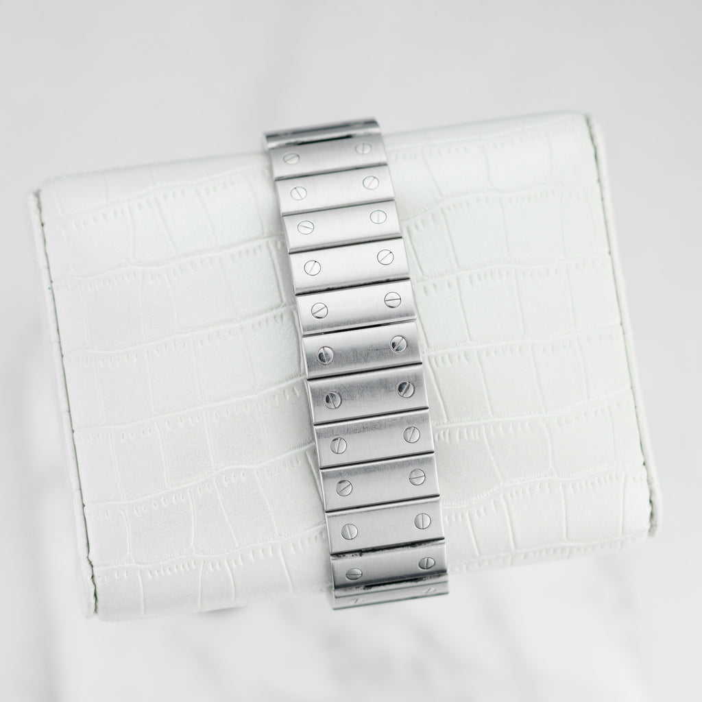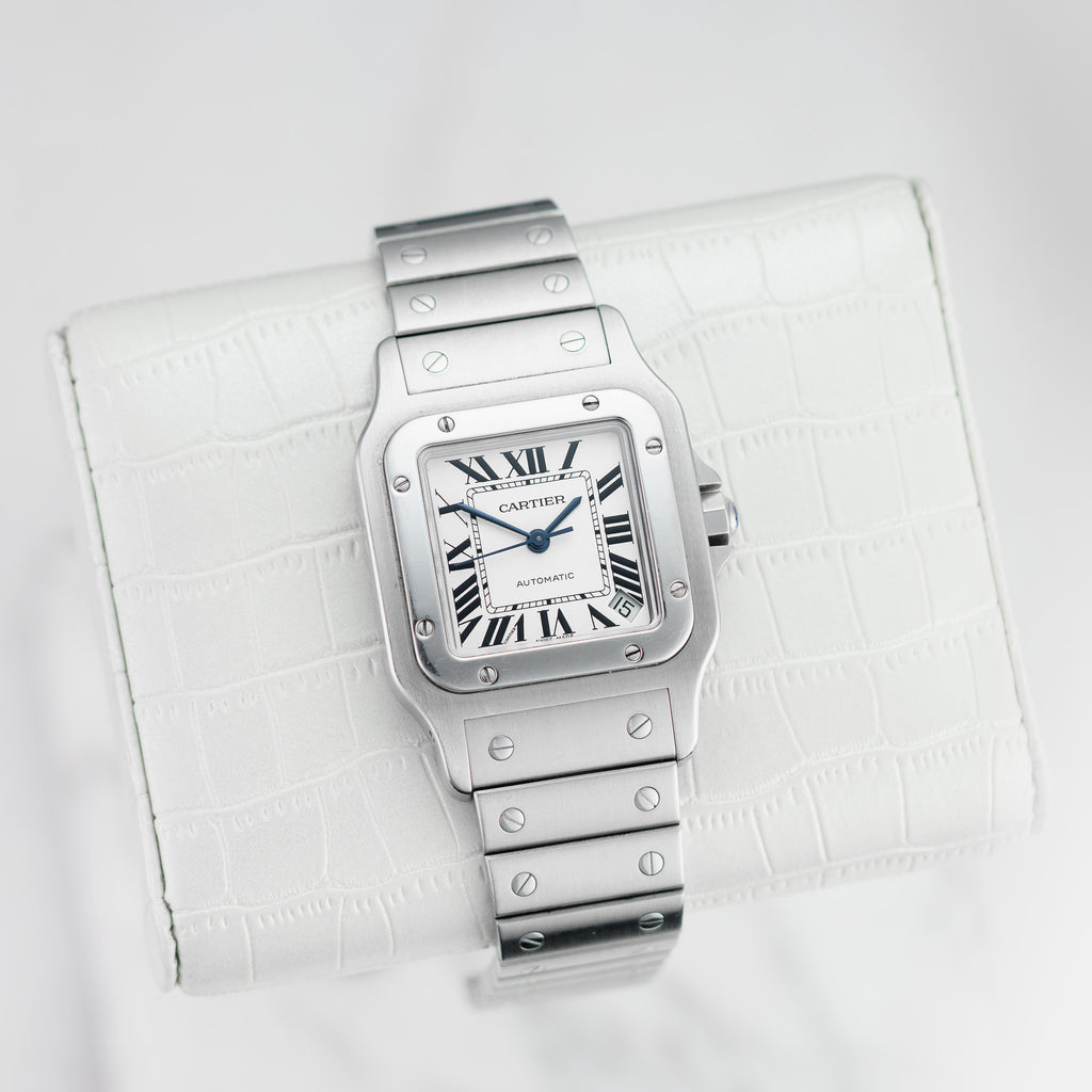 Description: Unveil sophistication with the Cartier Santos Galbee, a stunning watch that seamlessly blends luxury and practicality. Featuring a sleek stainless steel case measuring 32mm by 45mm, this timepiece is designed for those who appreciate both style and functionality. The iconic square dial, complemented by bold Roman numerals, adds a touch of classic charm. Perfect for any occasion, this watch transitions effortlessly from day to night, making it an essential addition to your collection. Whether for yourself or as a gift, the Cartier Santos Galbee is a statement piece that speaks to your refined taste and love for exquisite craftsmanship.