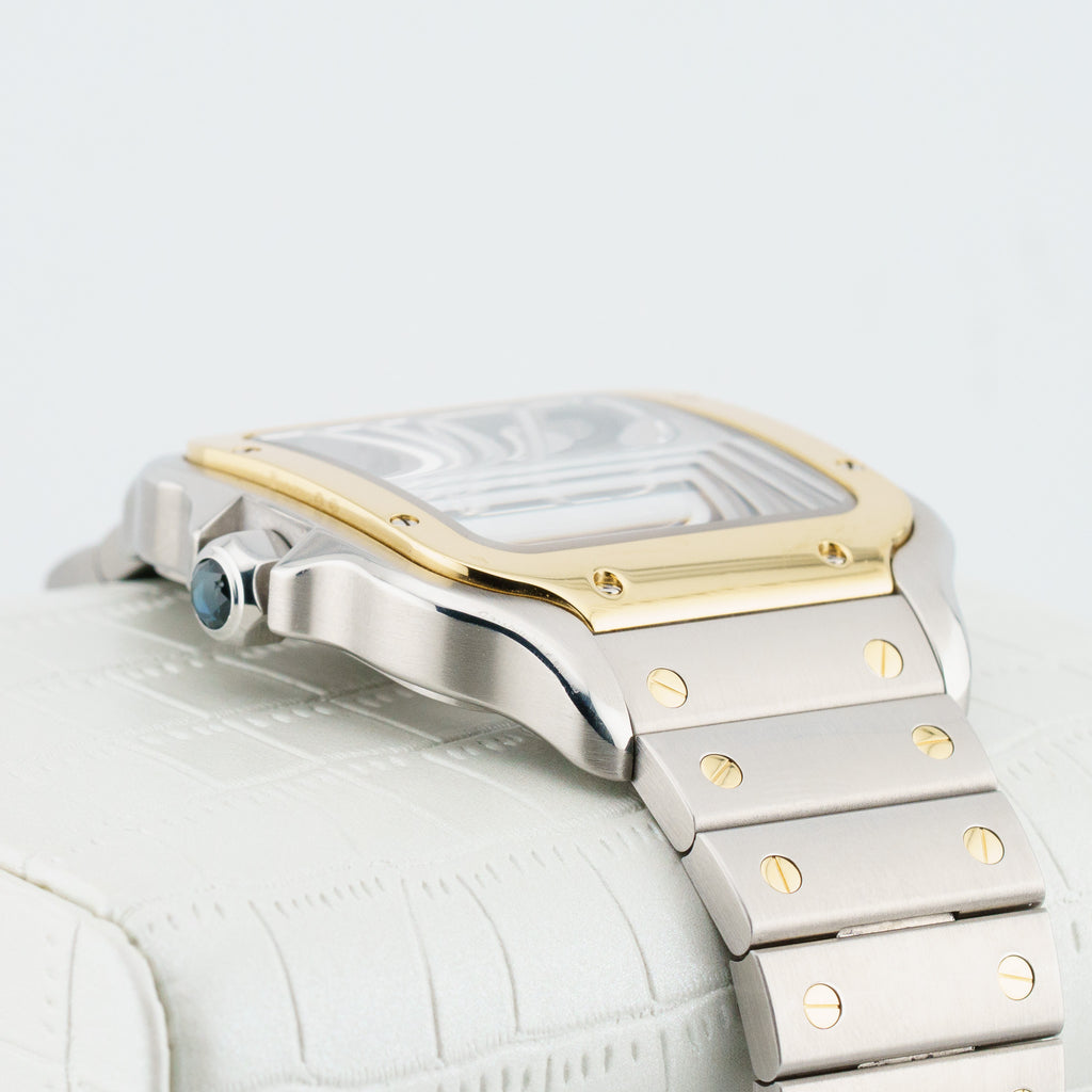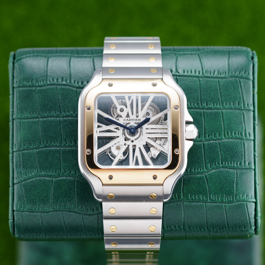 Description: Explore the Cartier Santos Skeleton WHSA0019, a stunning timepiece that combines elegance and innovation. Crafted with a striking stainless steel and yellow gold case, this 39mm watch showcases a captivating skeleton dial that reveals the intricate movement within. Perfect for those who appreciate fine craftsmanship, it seamlessly blends luxury with modern design. The bold color contrast adds a touch of sophistication, making it an ideal accessory for any occasion. Whether you're dressing up for an event or enhancing your everyday style, the Santos Skeleton is sure to turn heads and spark conversation. Make it yours today and redefine your watch collection.