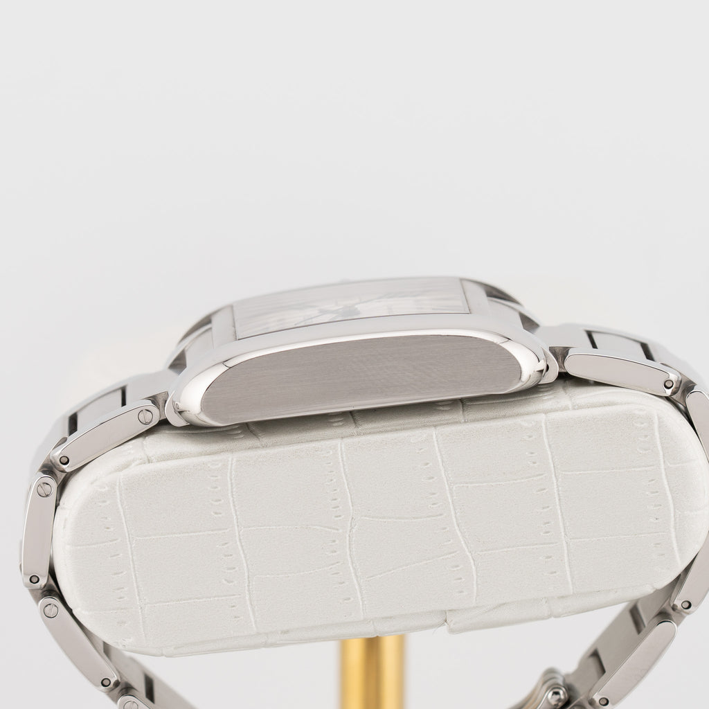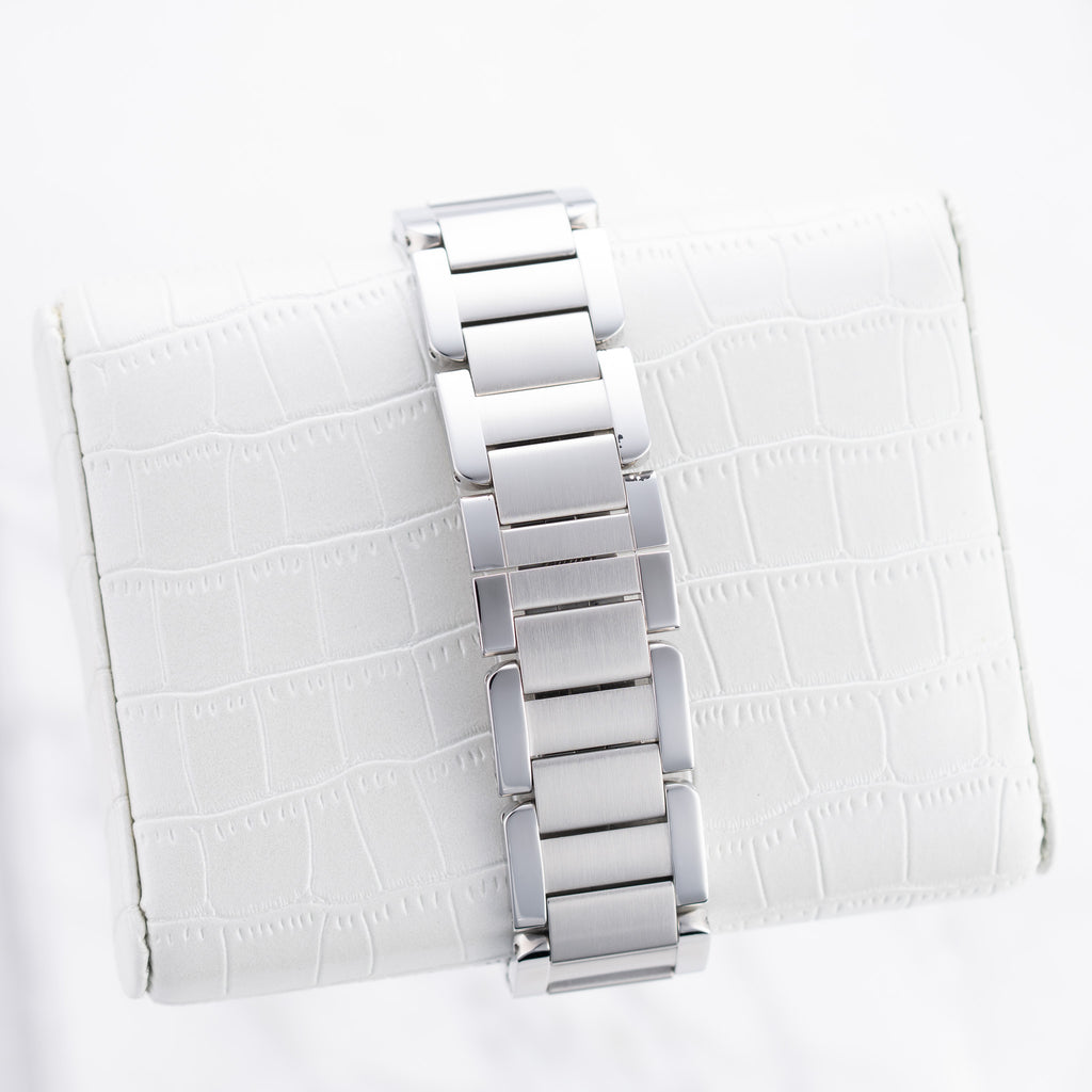 Description: The Cartier Tank Anglaise in stainless steel is a stunning blend of elegance and modernity. With its distinctive rectangular case measuring 39.2mm x 29.8mm, this watch embodies the essence of Cartier’s iconic design. The sleek lines and refined finish make it a versatile accessory for both casual and formal occasions. Adorned with a classic leather strap, it offers a comfortable fit while exuding sophistication. The unique crown integrated into the case adds a touch of innovation, ensuring you stand out in any setting. Whether you're dressing up or down, this watch is the perfect statement piece for any occasion.