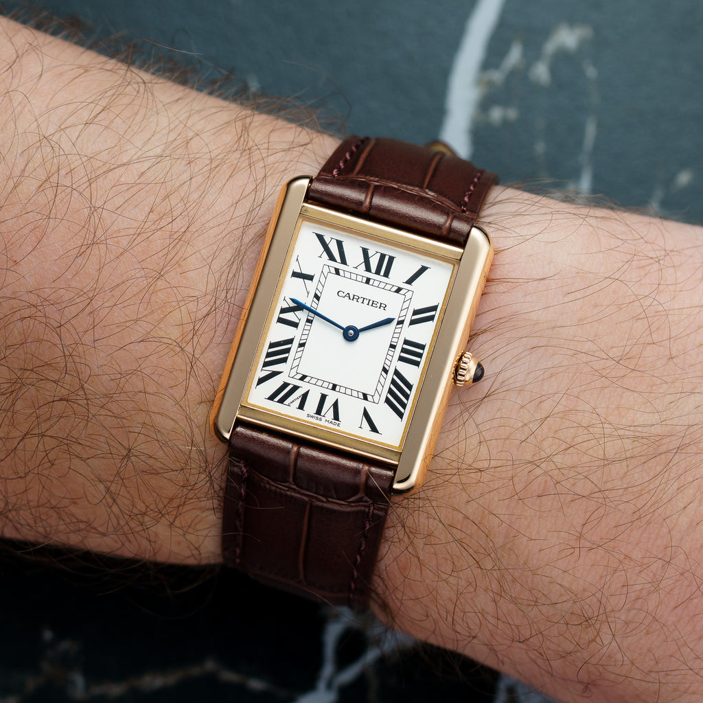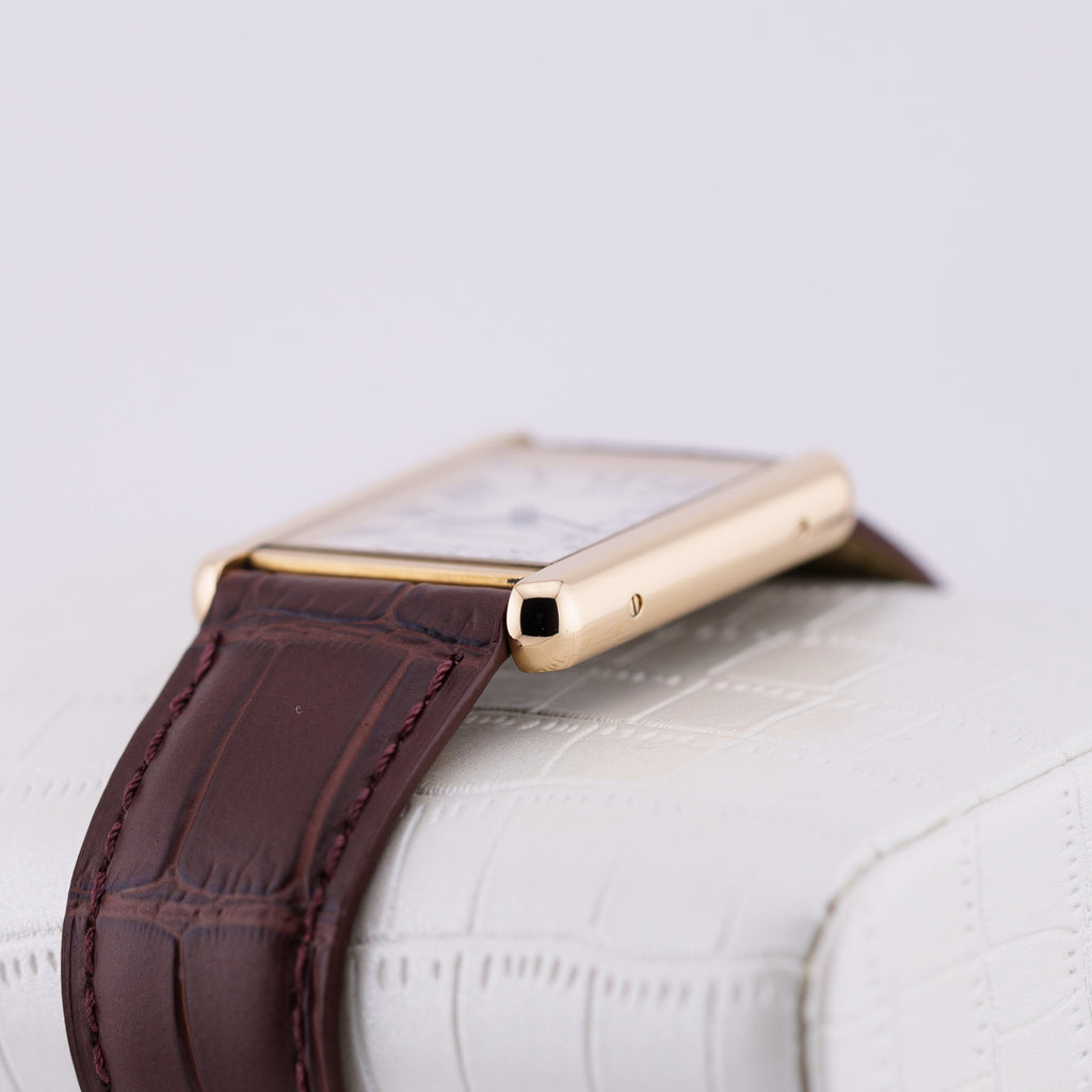 Description: Indulge in the elegance of the Cartier Tank, featuring a stunning rose gold case that beautifully frames its 34.8mm by 27.4mm silhouette. This exquisite watch embodies the perfect blend of sophistication and style, making it an essential accessory for any wardrobe. The classic design seamlessly marries vintage charm with modern sensibility, ensuring it stands out on any occasion. With its rich history and iconic status, this timepiece is not just a watch but a statement. Whether at a formal event or a casual outing, this Cartier piece will always catch the eye and spark conversations. Embrace your individuality with this luxurious watch.