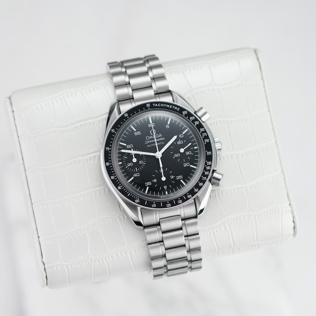 Description: Unleash your passion for precision with the Omega Speedmaster Reduced, a stunning blend of style and functionality. Crafted with a robust stainless steel case and a comfortable 39mm size, this watch is perfect for any occasion, whether you're in the boardroom or enjoying a weekend adventure. The iconic chronograph features a striking black dial that effortlessly complements its sleek design. With its rich heritage and impeccable craftsmanship, this timepiece not only tells time but tells a story of innovation. Make a statement that resonates with your unique taste and appreciate the artistry behind this remarkable watch.